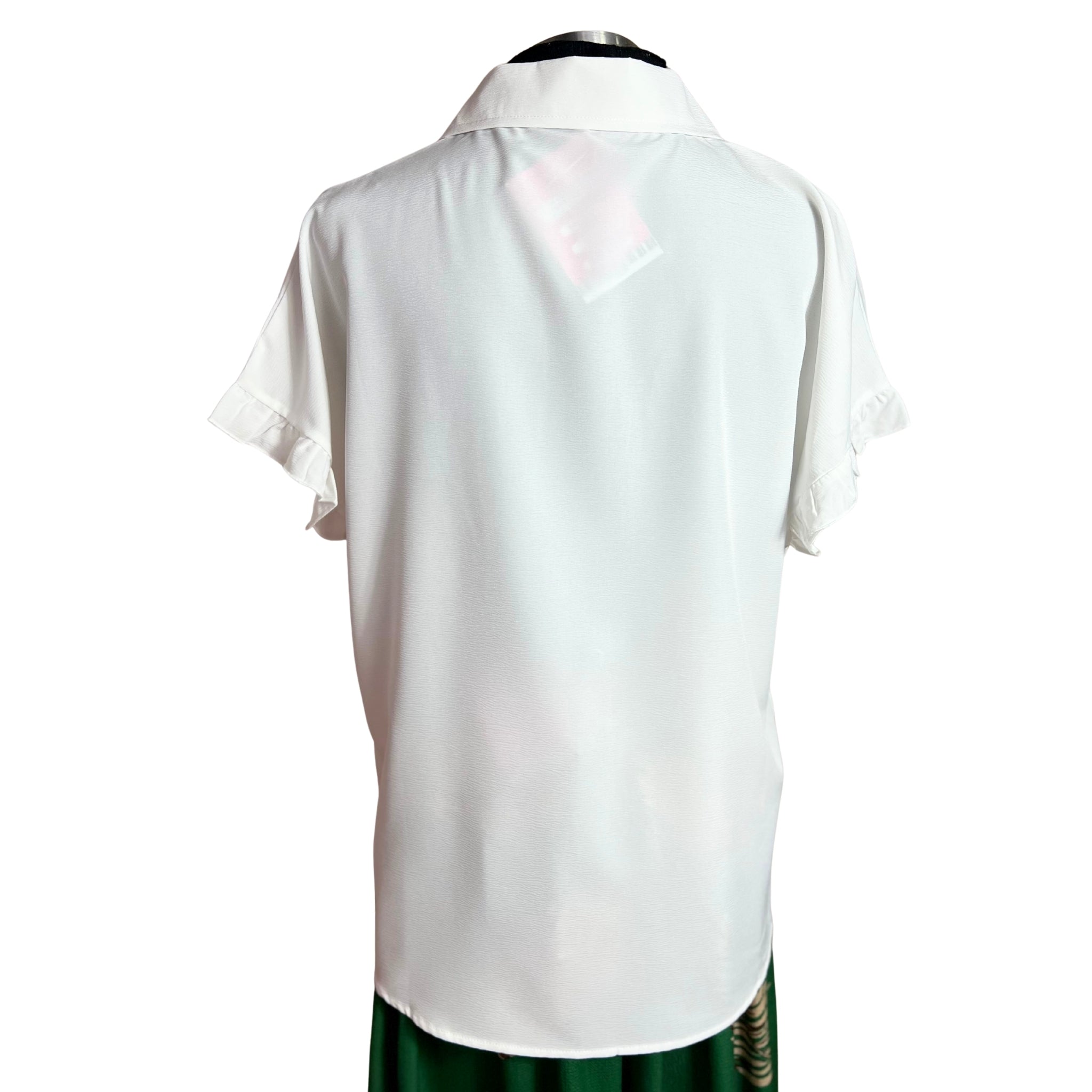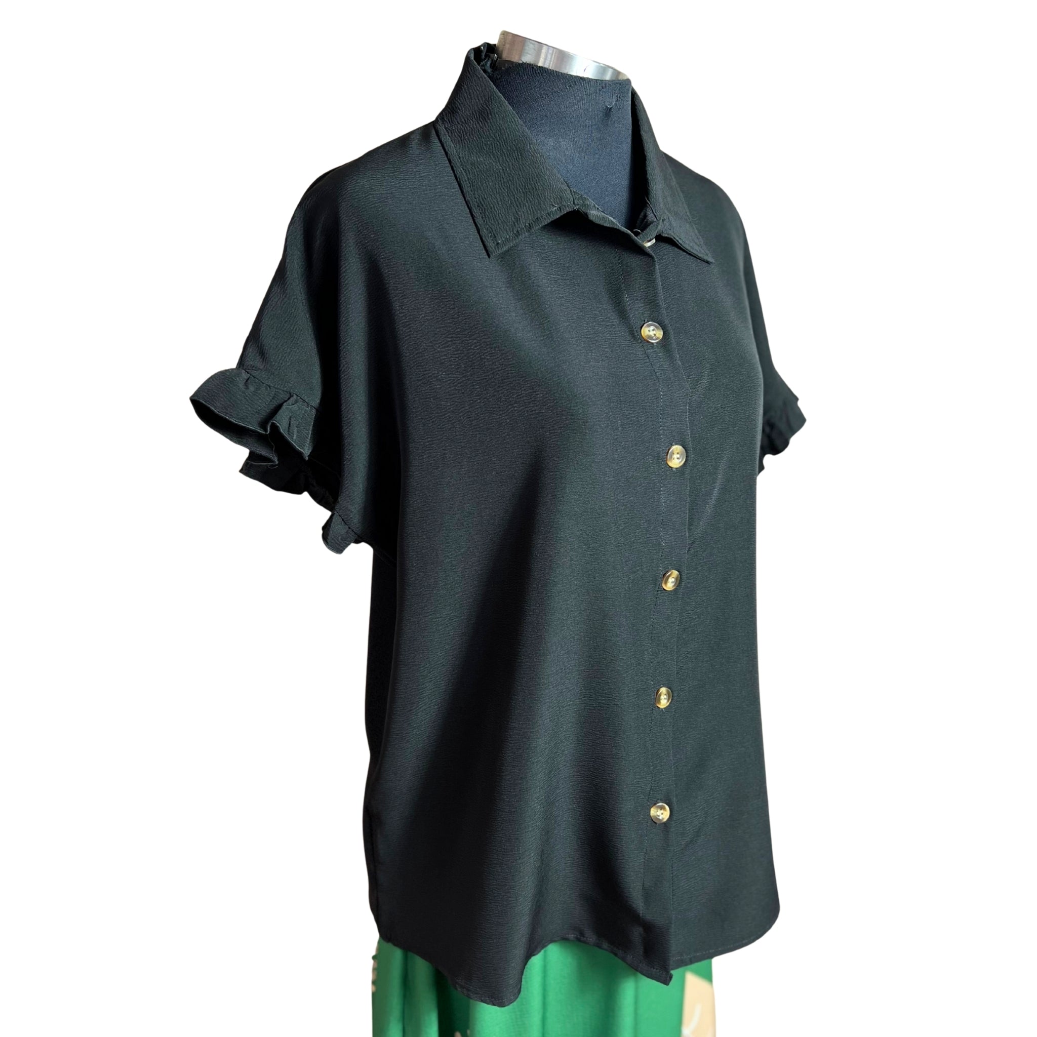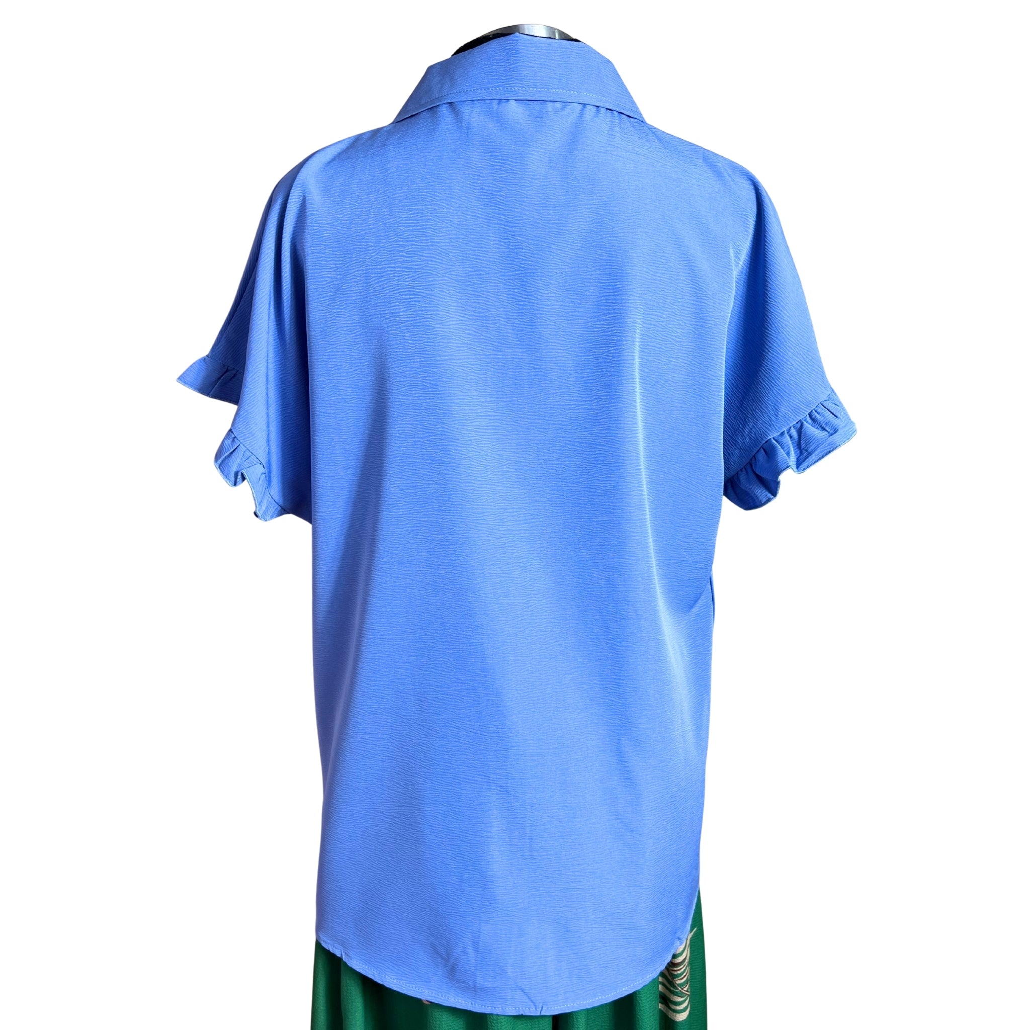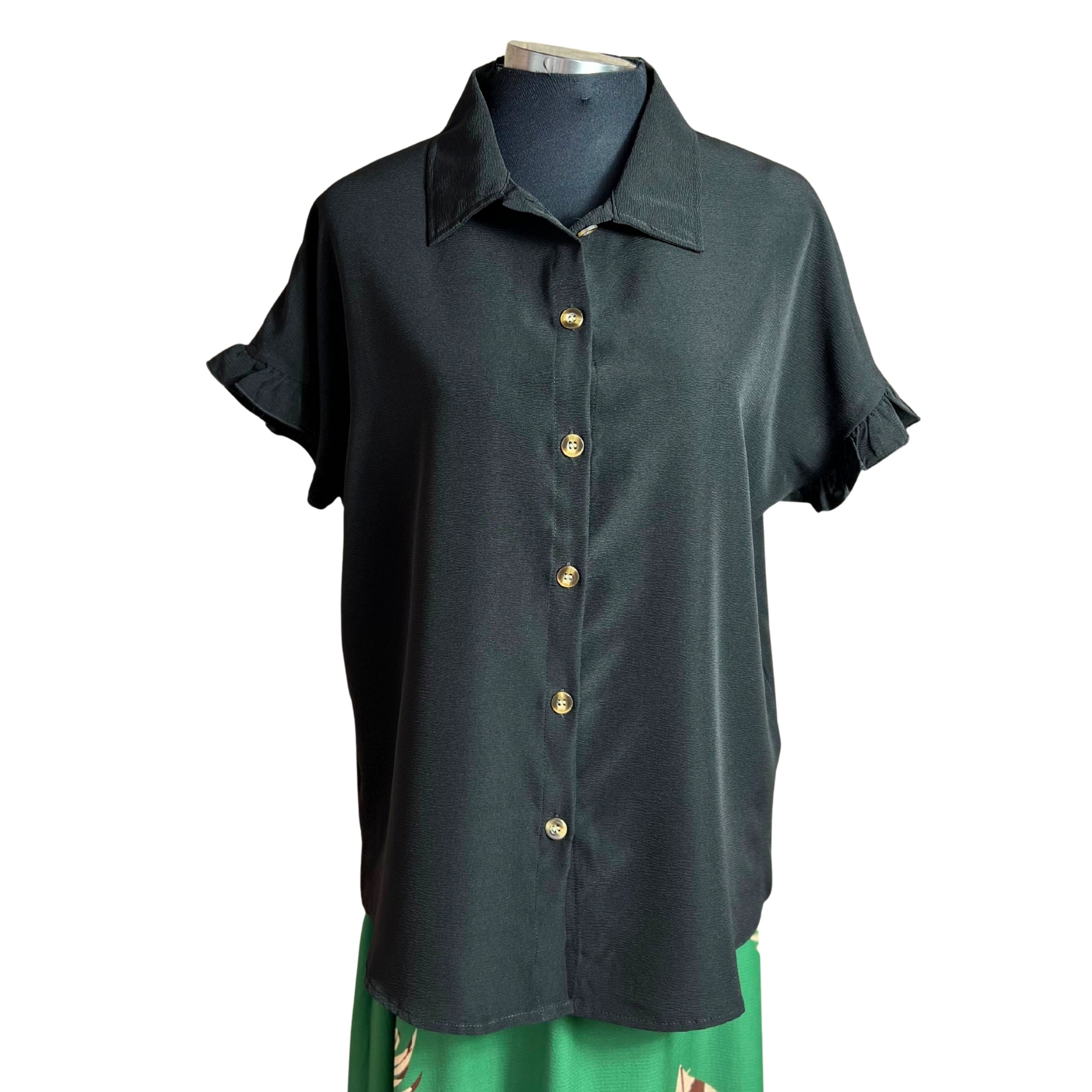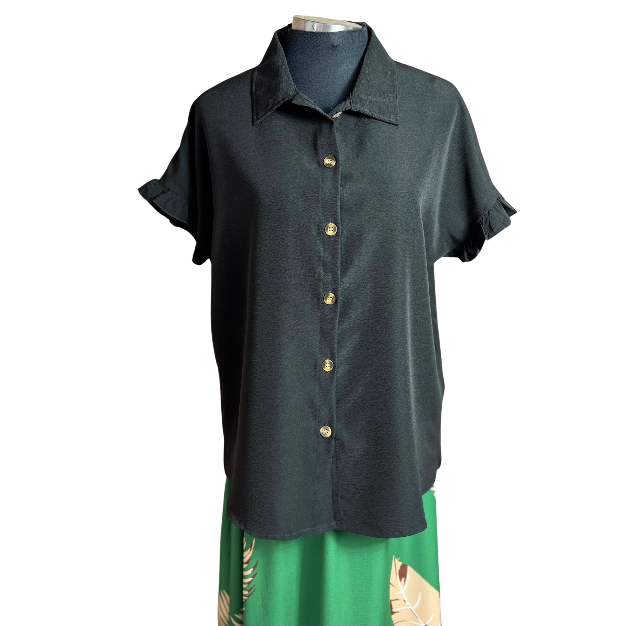 Blusa camisera de manga corta con detalles de vuelos que combina elegancia y comodidad. Su corte versátil se adapta a cualquier ocasión, desde el trabajo hasta encuentros casuales. Los vuelos en las mangas añaden movimiento y feminidad a tu outfit, mientras que la tela respirable garantiza frescura durante todo el día. Perfecta para crear outfits modernos y sofisticados sin sacrificar la practicidad.