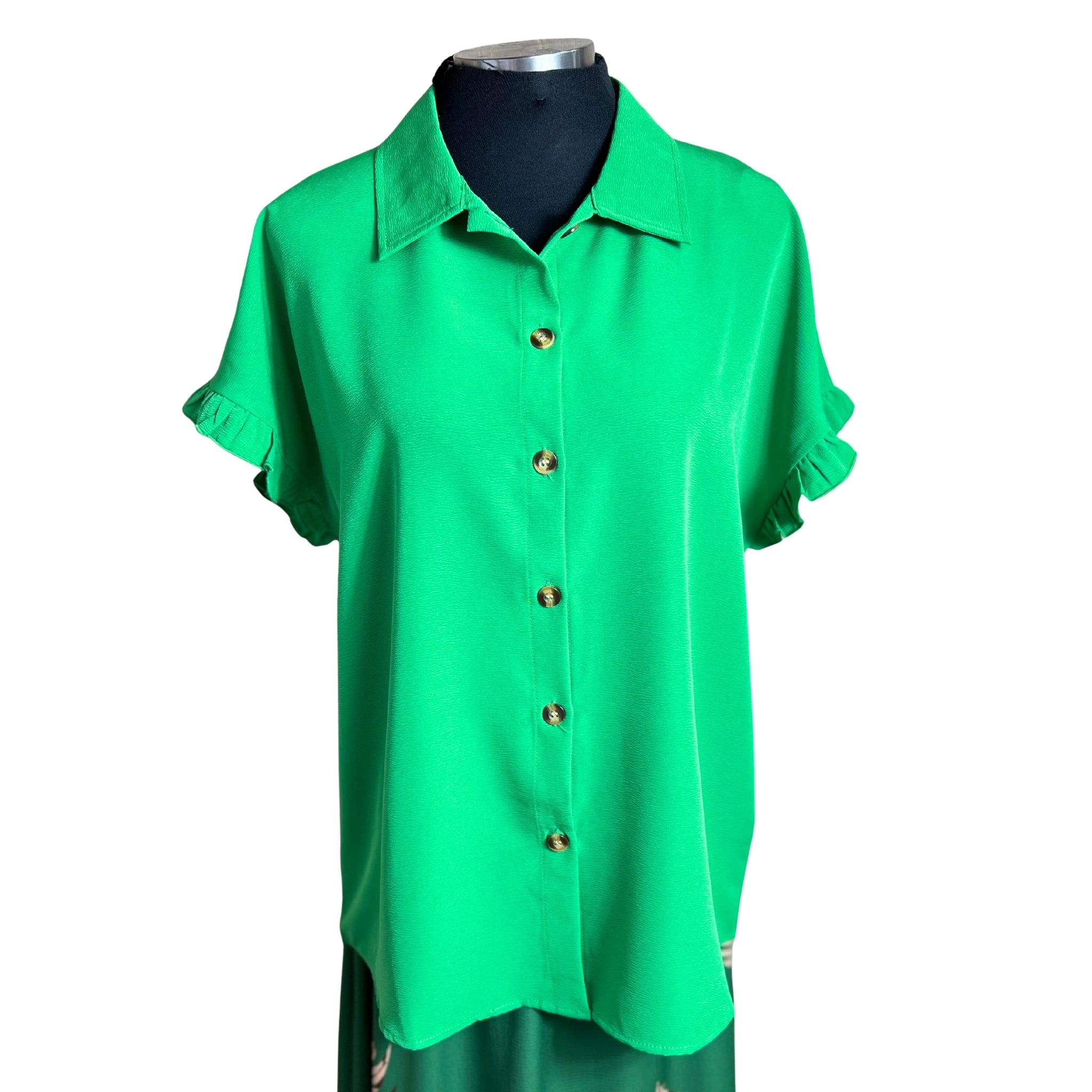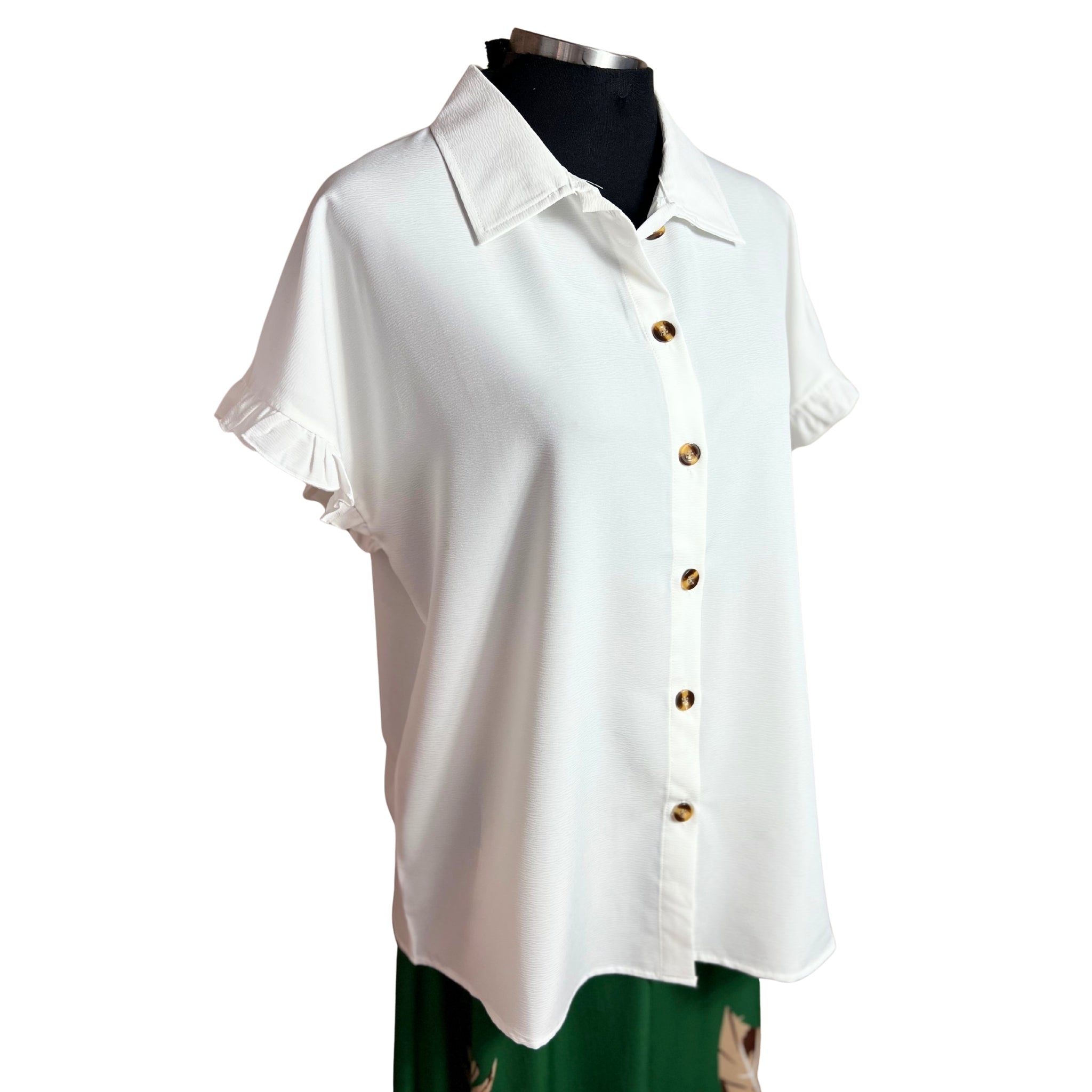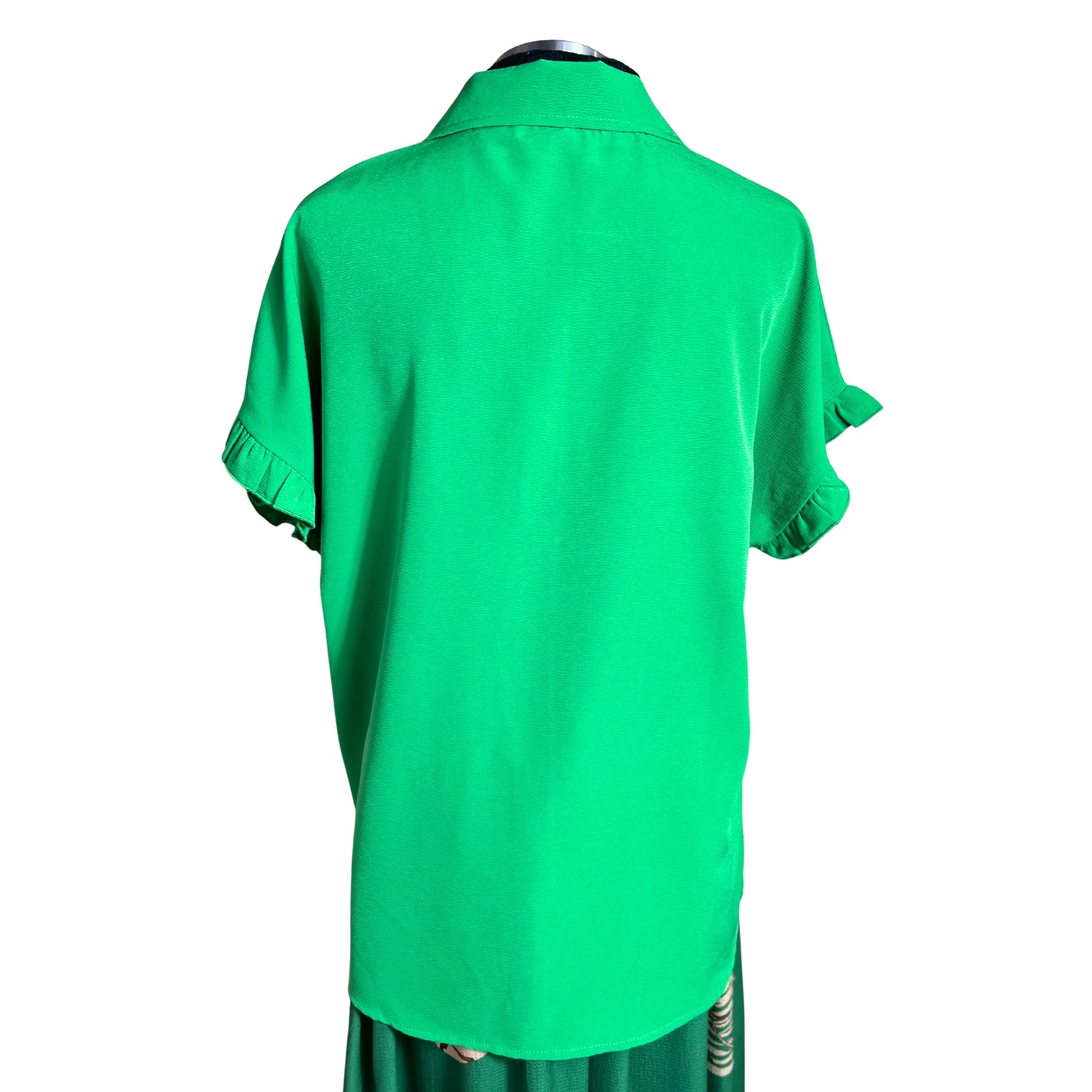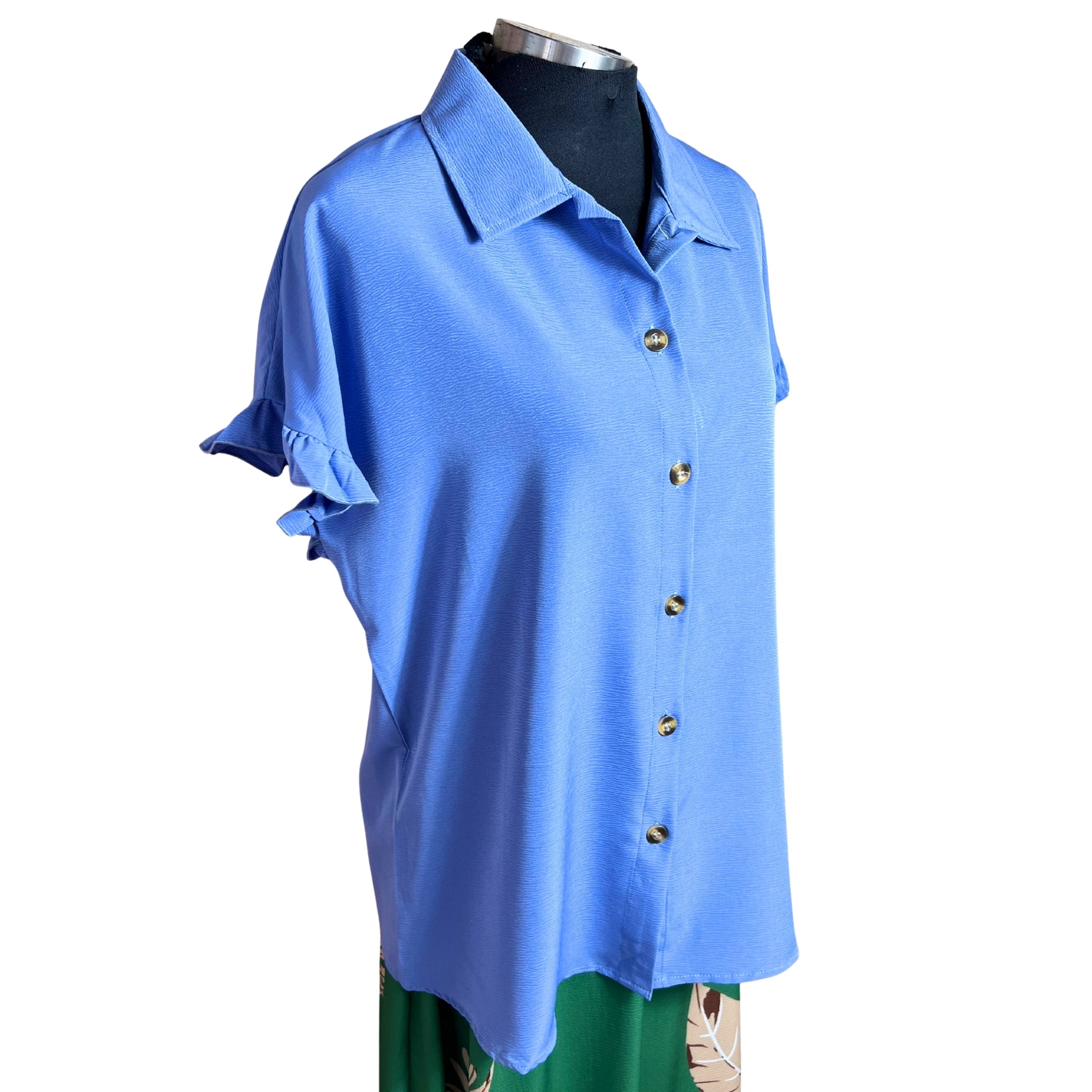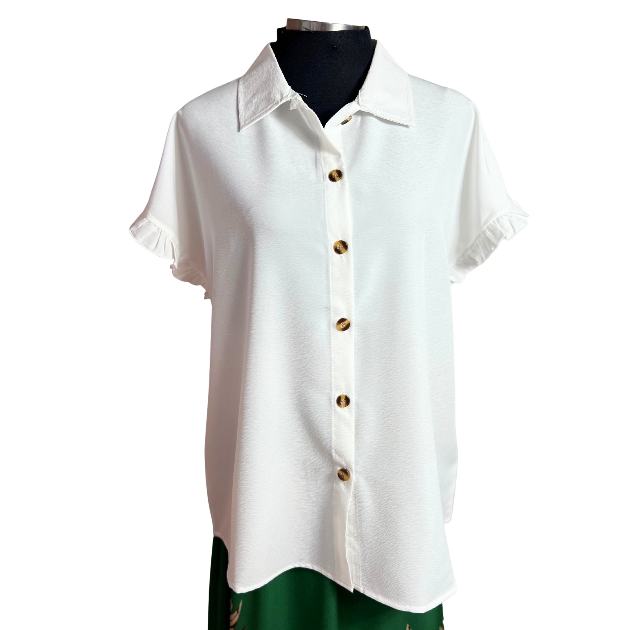 Blusa camisera de manga corta con detalles de vuelos que combina elegancia y comodidad. Su corte versátil se adapta a cualquier ocasión, desde el trabajo hasta encuentros casuales. Los vuelos en las mangas añaden movimiento y feminidad a tu outfit, mientras que la tela respirable garantiza frescura durante todo el día. Perfecta para crear outfits modernos y sofisticados sin sacrificar la practicidad.