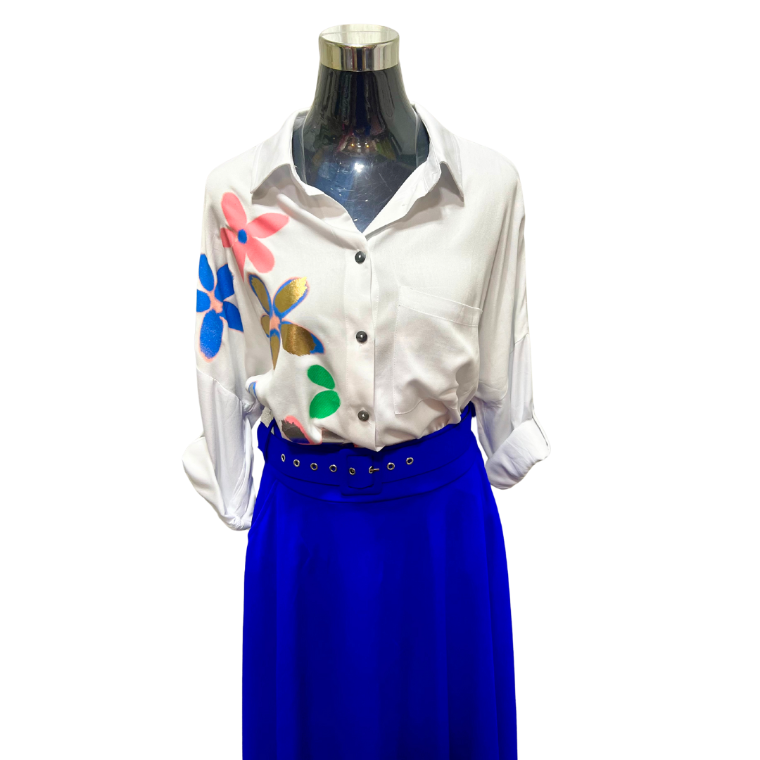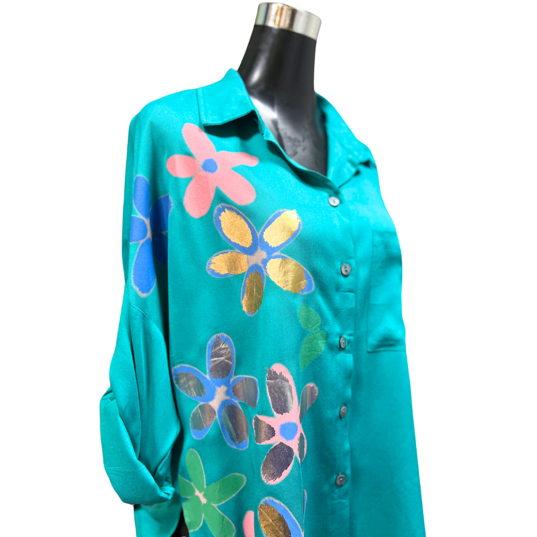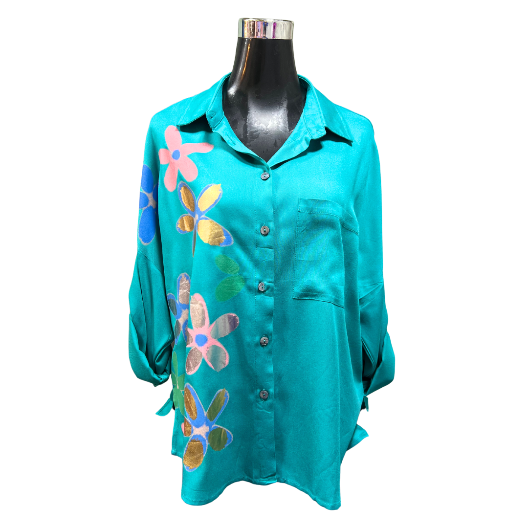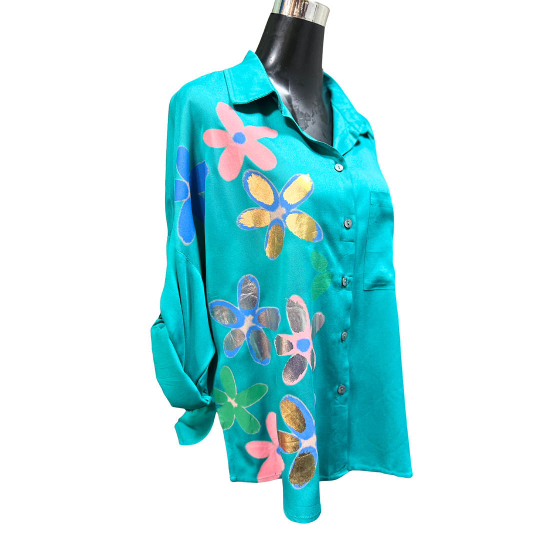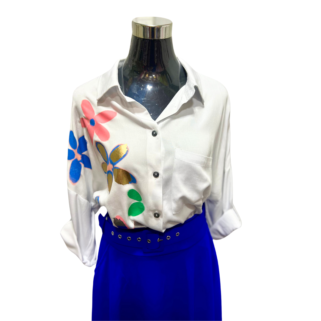 Eleva tu estilo con la Blusa Abotonada Flor Metálica. Esta prenda te hará sentir segura y elegante, gracias al toque metálico en su diseño.