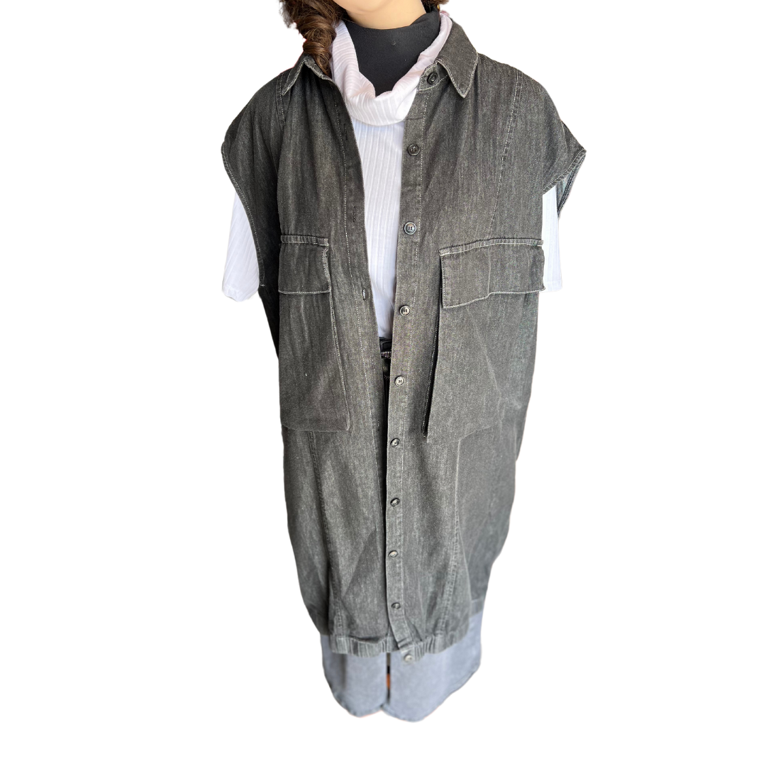 Chaqueta de mezclilla sin mangas abotonada. Diseño moderno y práctico para un look casual y fresco. Ideal para cualquier ocasión y fácil de combinar. Hazte con la tuya y disfruta de su comodidad sin perder estilo. ¡Haz una declaración de moda con esta chaqueta única!