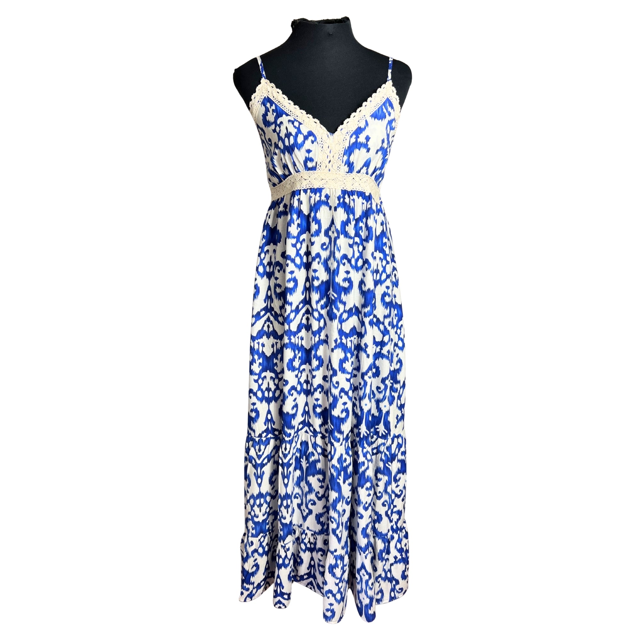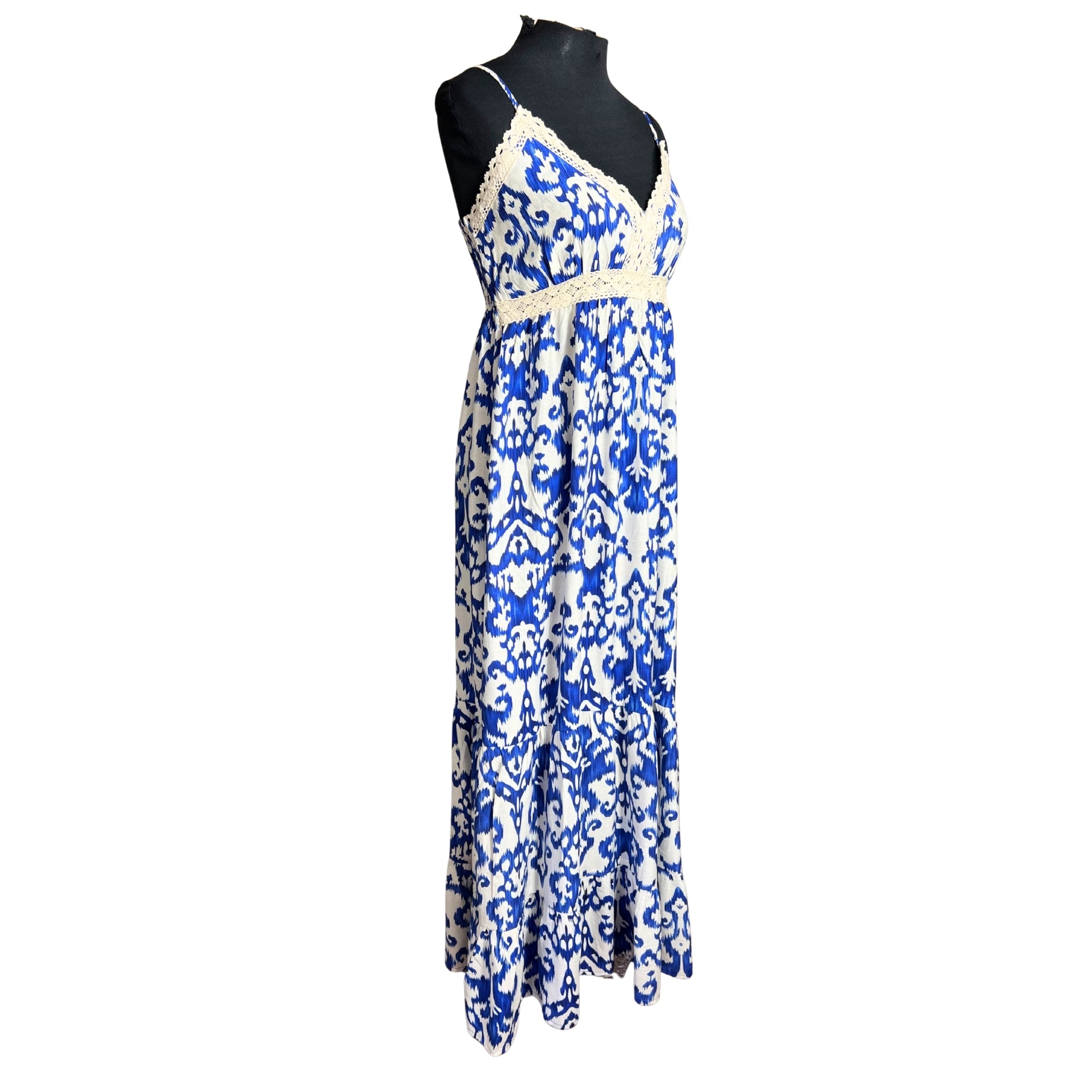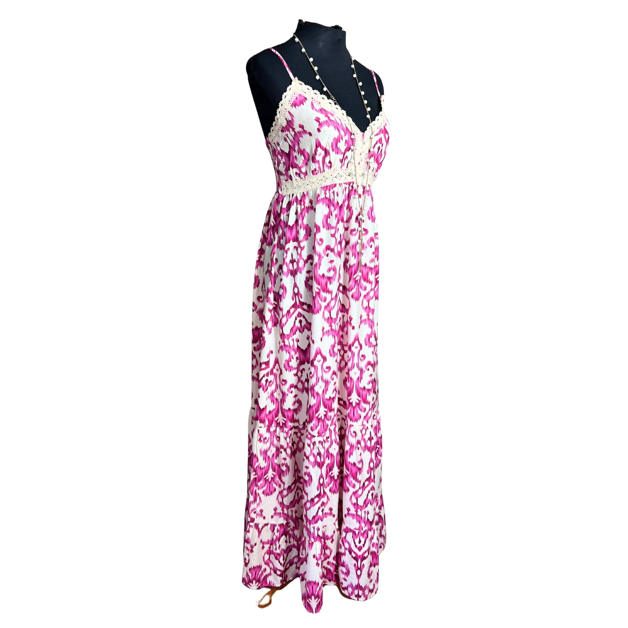 Descubre la elegancia bohemia en este maxi vestido que fusiona tradición y estilo contemporáneo. El estampado Ikat Bombay étnico crea un patrón cautivador que refleja la riqueza cultural de Oriente, mientras que los delicados detalles en crochet añaden textura y sofisticación a cada movimiento. Perfecto para ocasiones especiales o para elevar tu outfit cotidiano, este vestido envolvente te permite lucir radiante con confianza. La caída fluida del tejido favorece tu silueta y proporciona comodidad durante todo el día. Una pieza versátil que trasciende tendencias y se convierte en un favorito atemporal de tu closet.