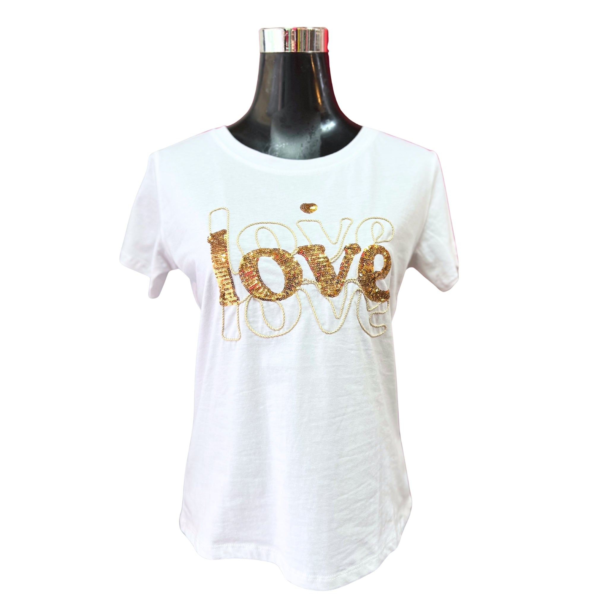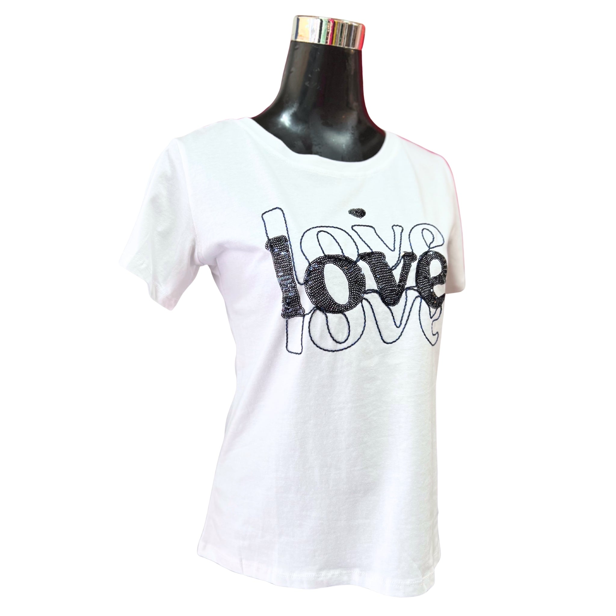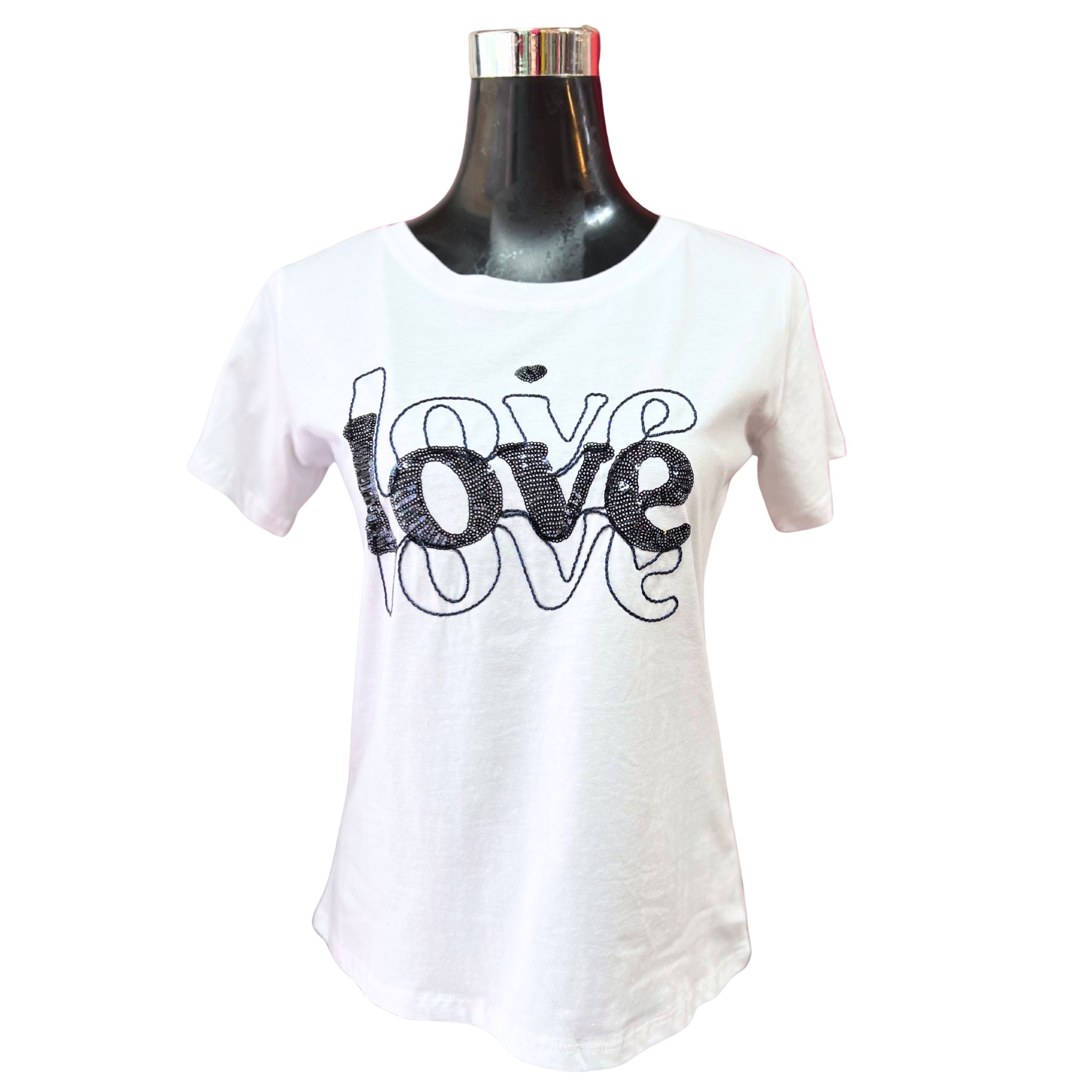 Esta polera blanca con la palabra "Love" decorada con lentejuelas brillantes aporta un toque de glamour y feminidad a tu outfit diario. Su diseño llamativo y sencillo a la vez permite combinarla fácilmente, realzando tu estilo con un detalle que captura la luz y llama la atención. Perfecta para destacar en cualquier ocasión sin perder comodidad.