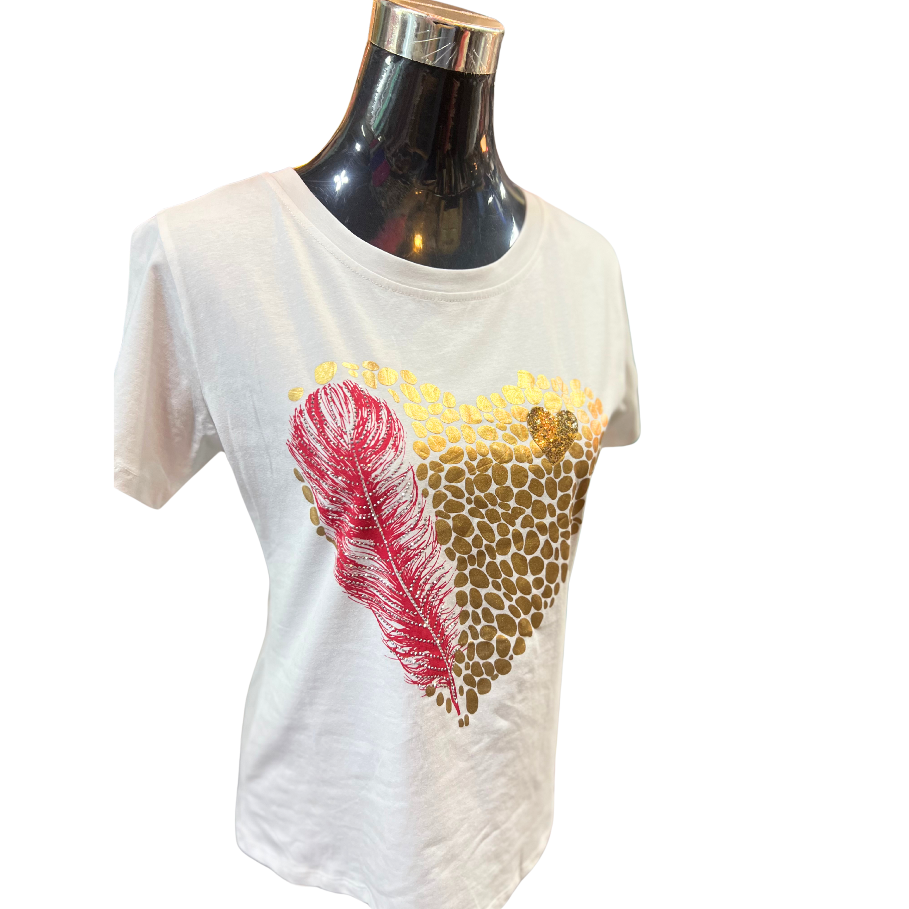 Esta polera de algodón destaca por su diseño de pluma y corazón, perfecto para un look sutil y con encanto. Su tejido cómodo y diseño versátil la hacen ideal para cualquier ocasión casual.