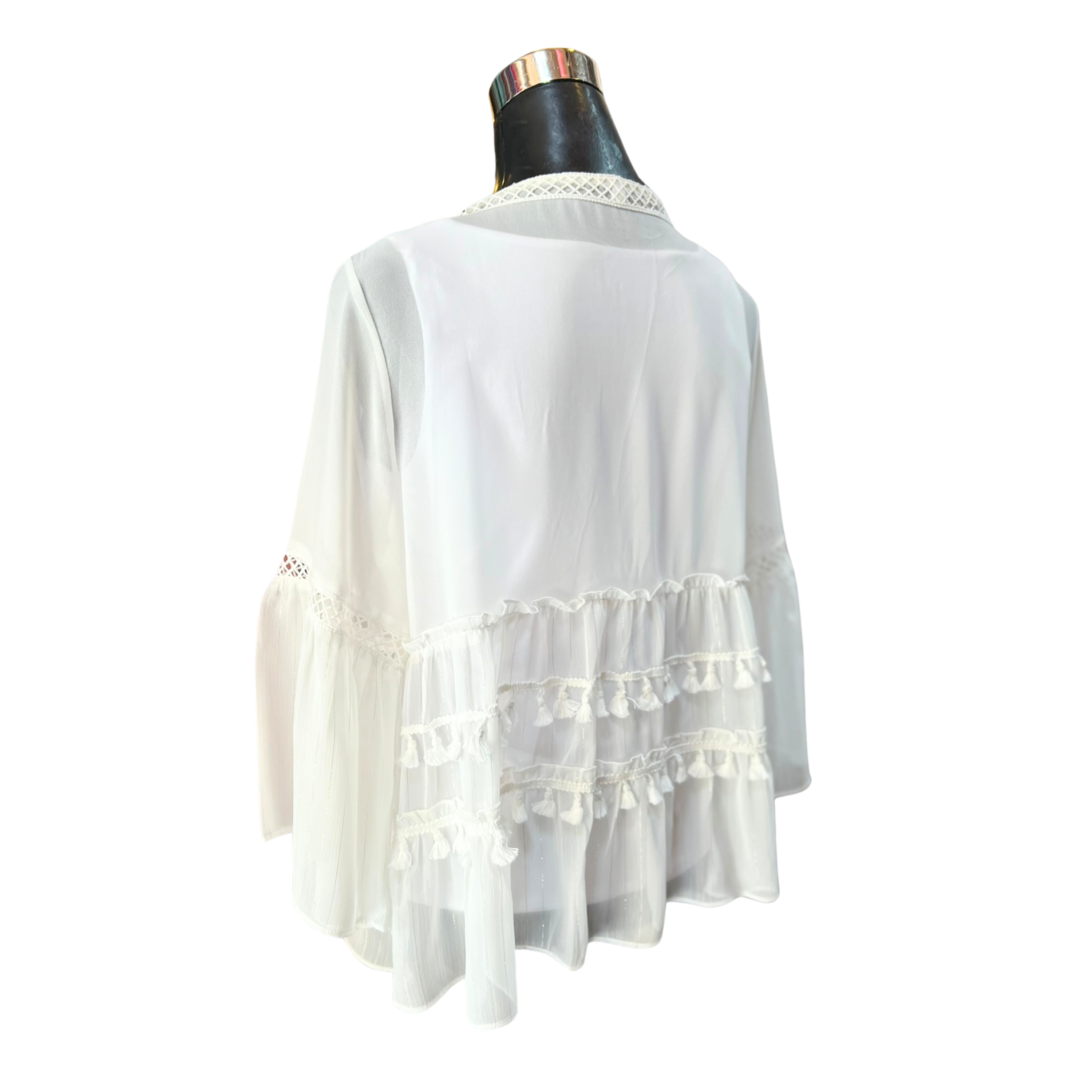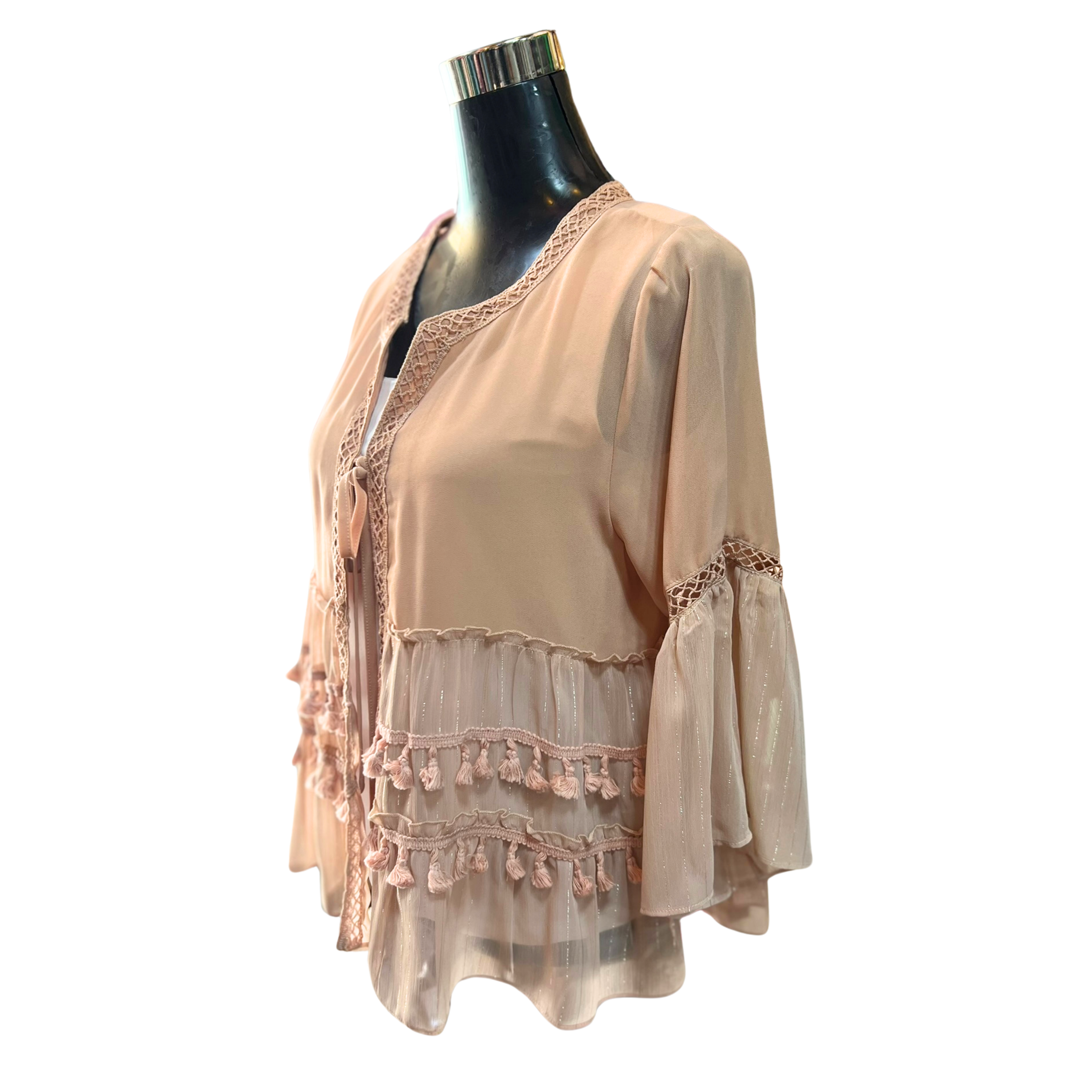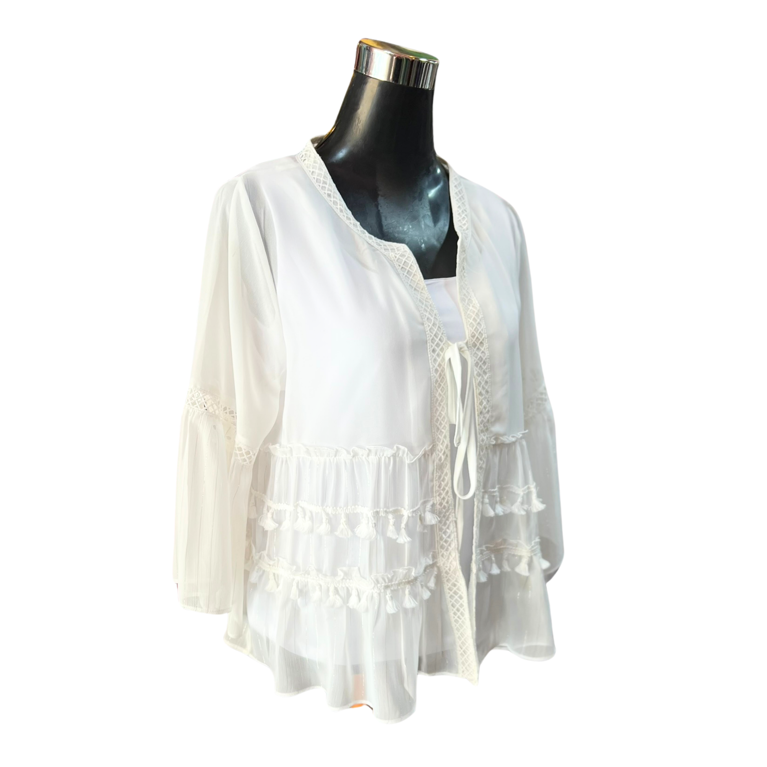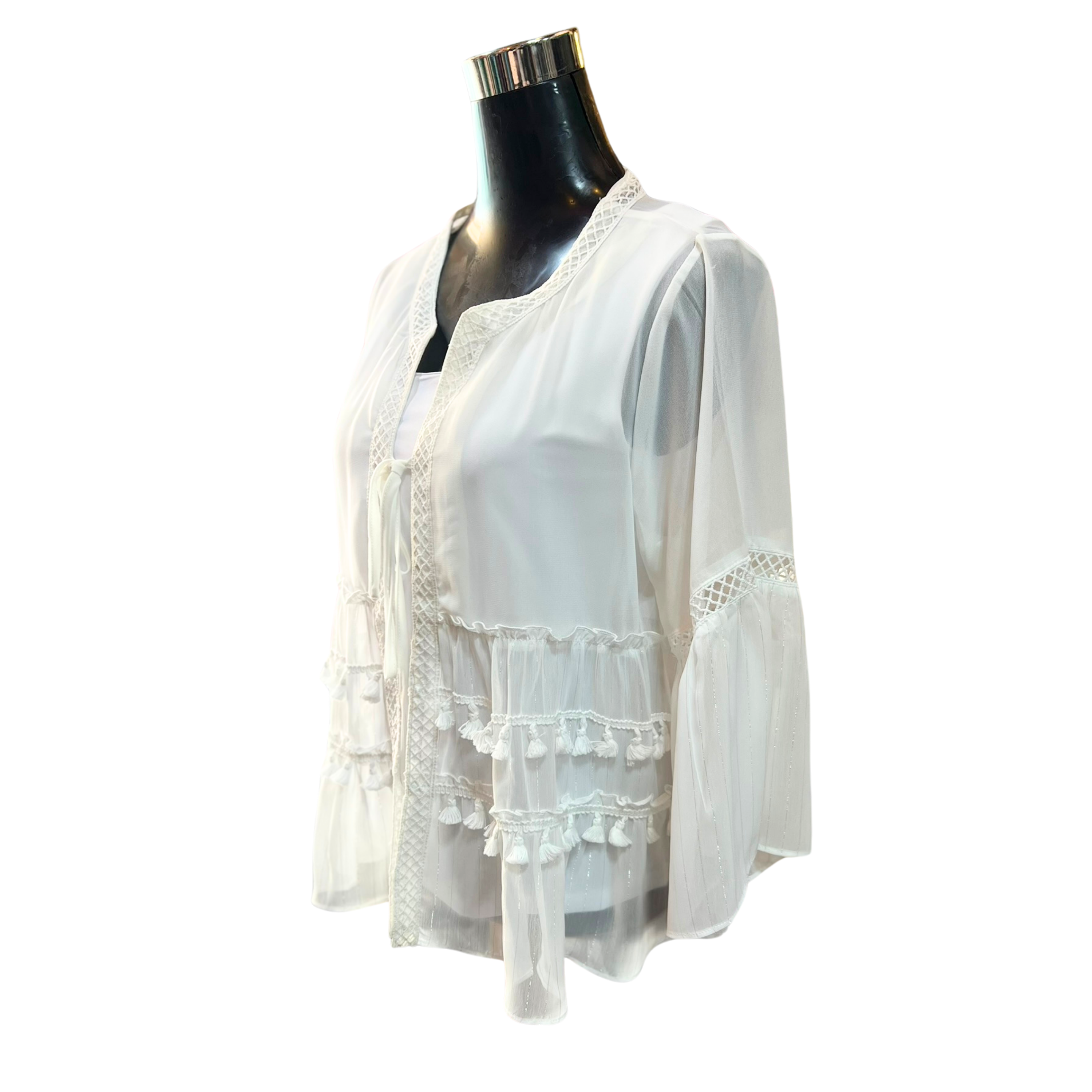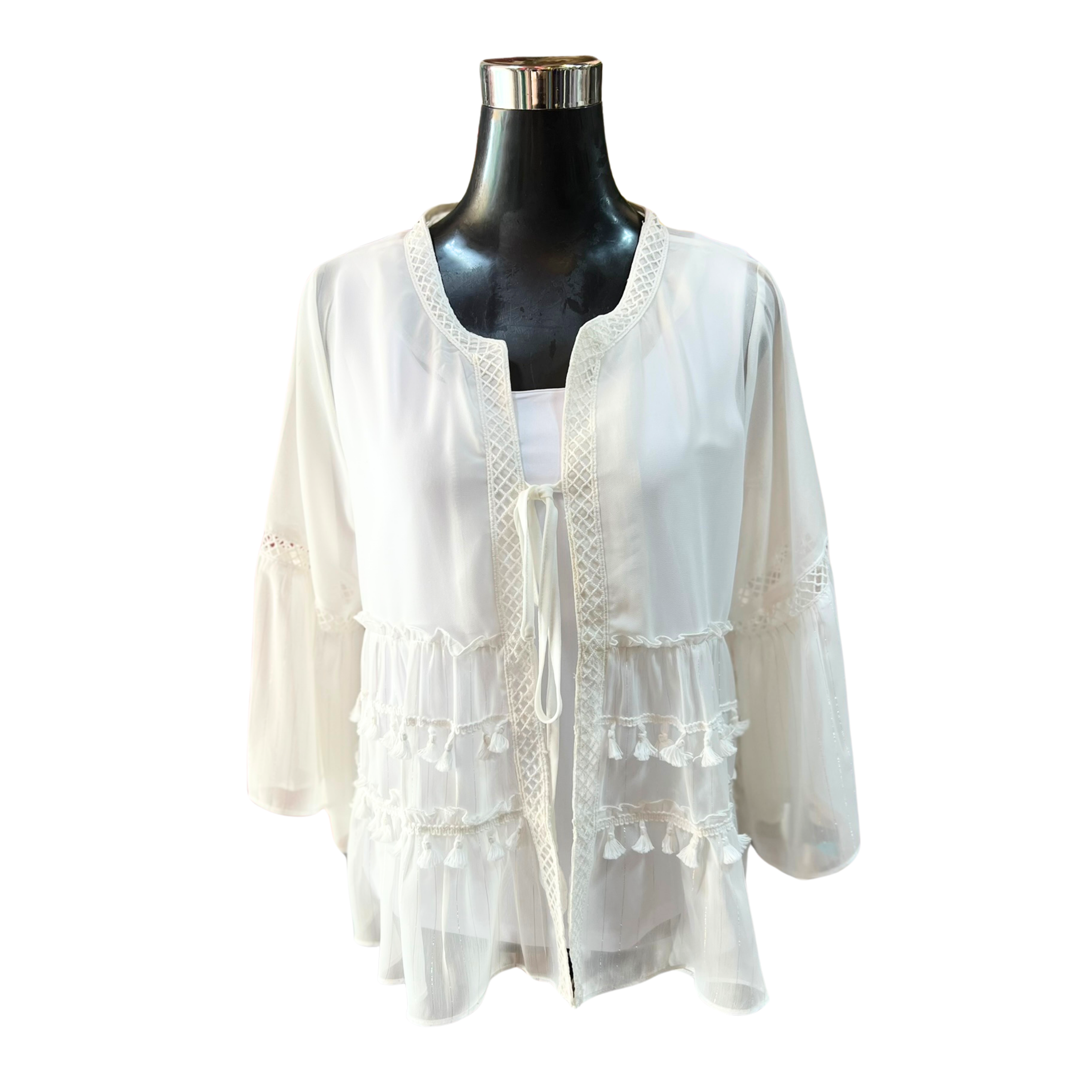 Añade un toque de elegancia y estilo a tu outfit con este tapado de gasa con lurex y detalles de flecos. Su diseño ligero y brillante lo convierte en una opción ideal para ocasiones especiales o para complementar tus looks de día o de noche. Perfecto para quienes buscan una prenda versátil y sofisticada.