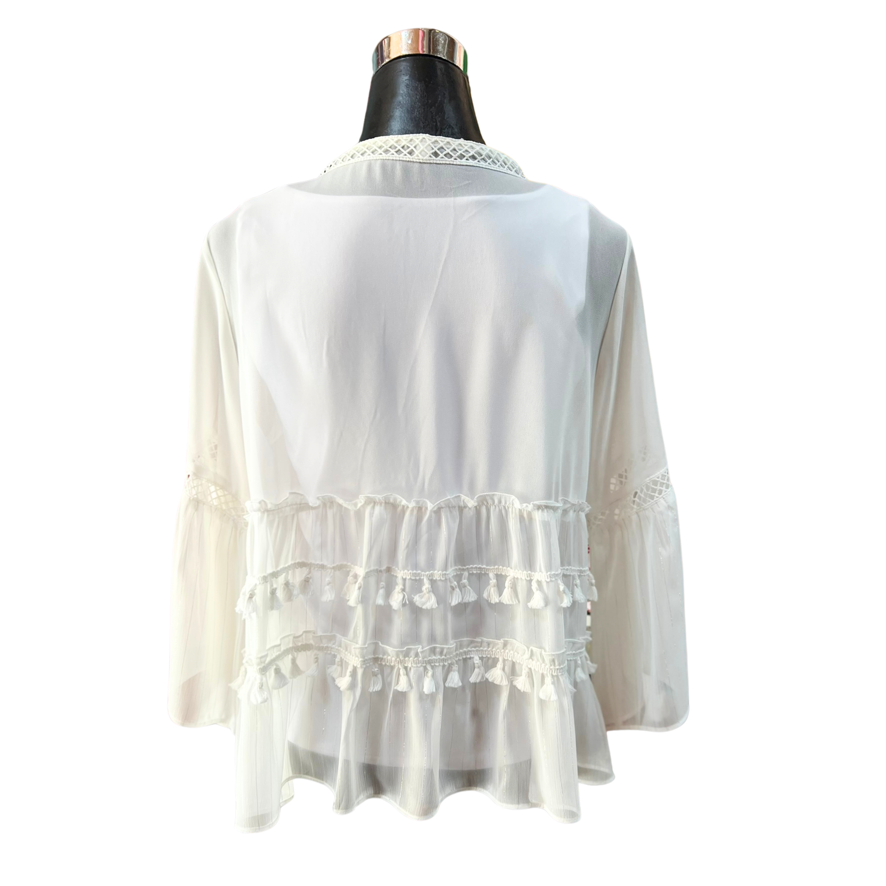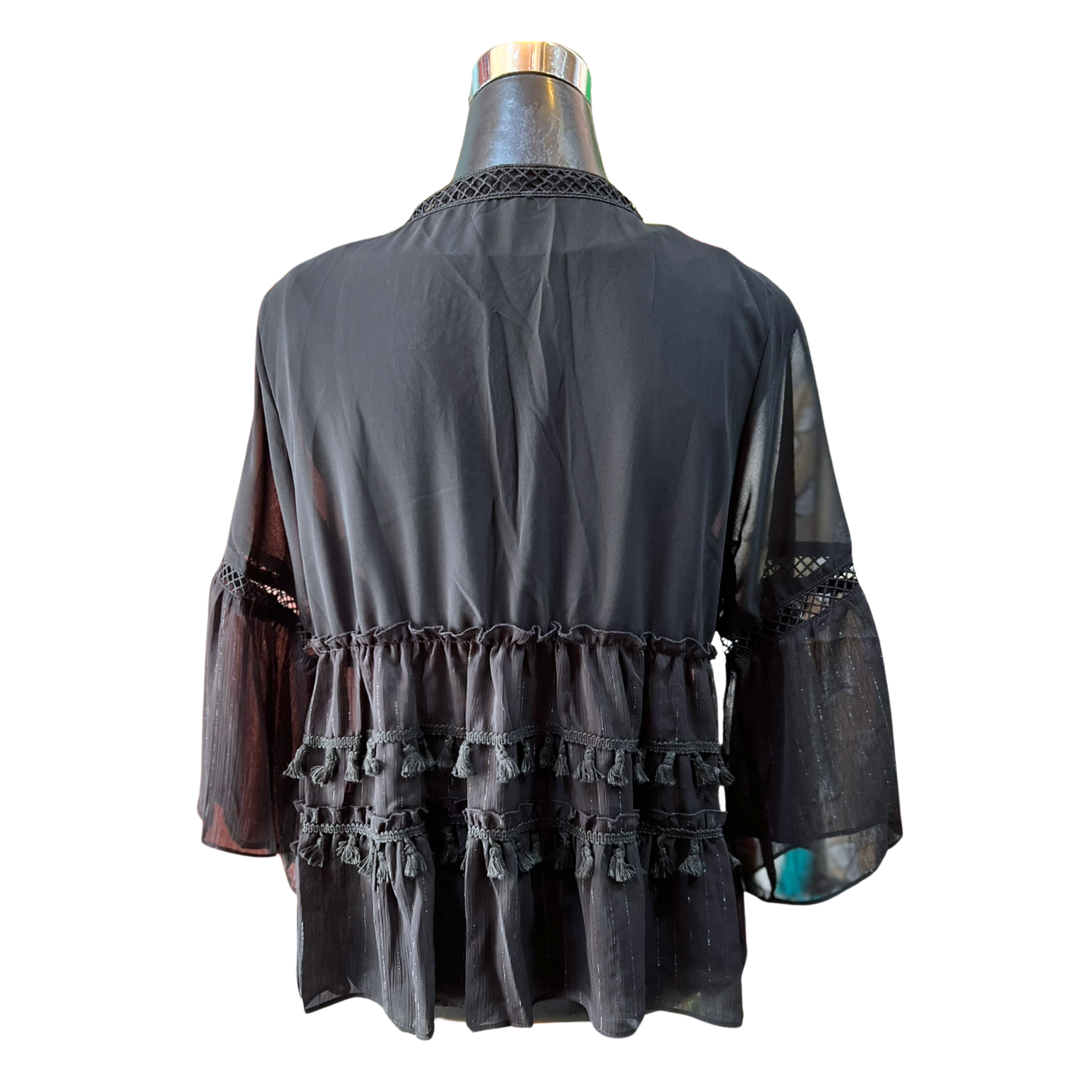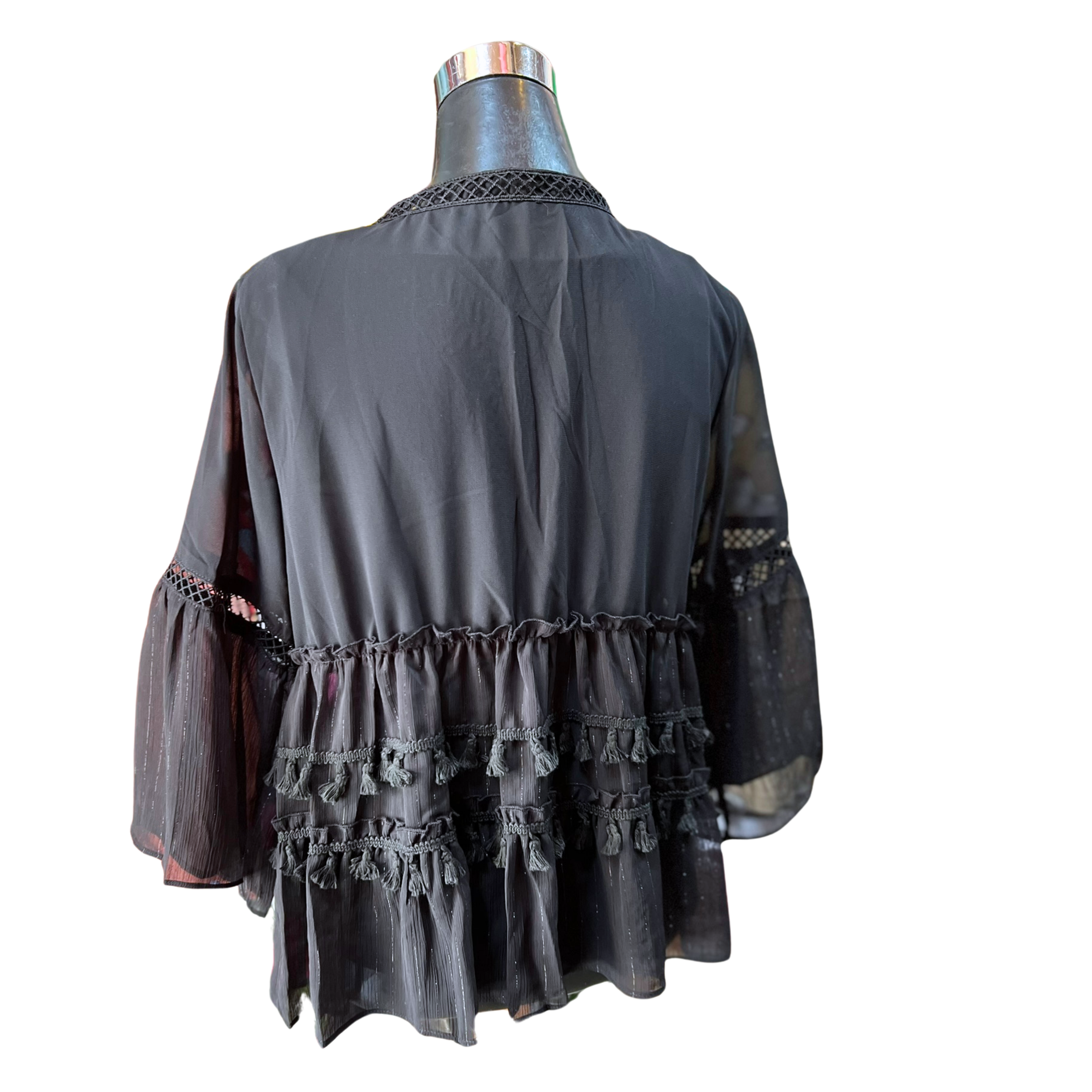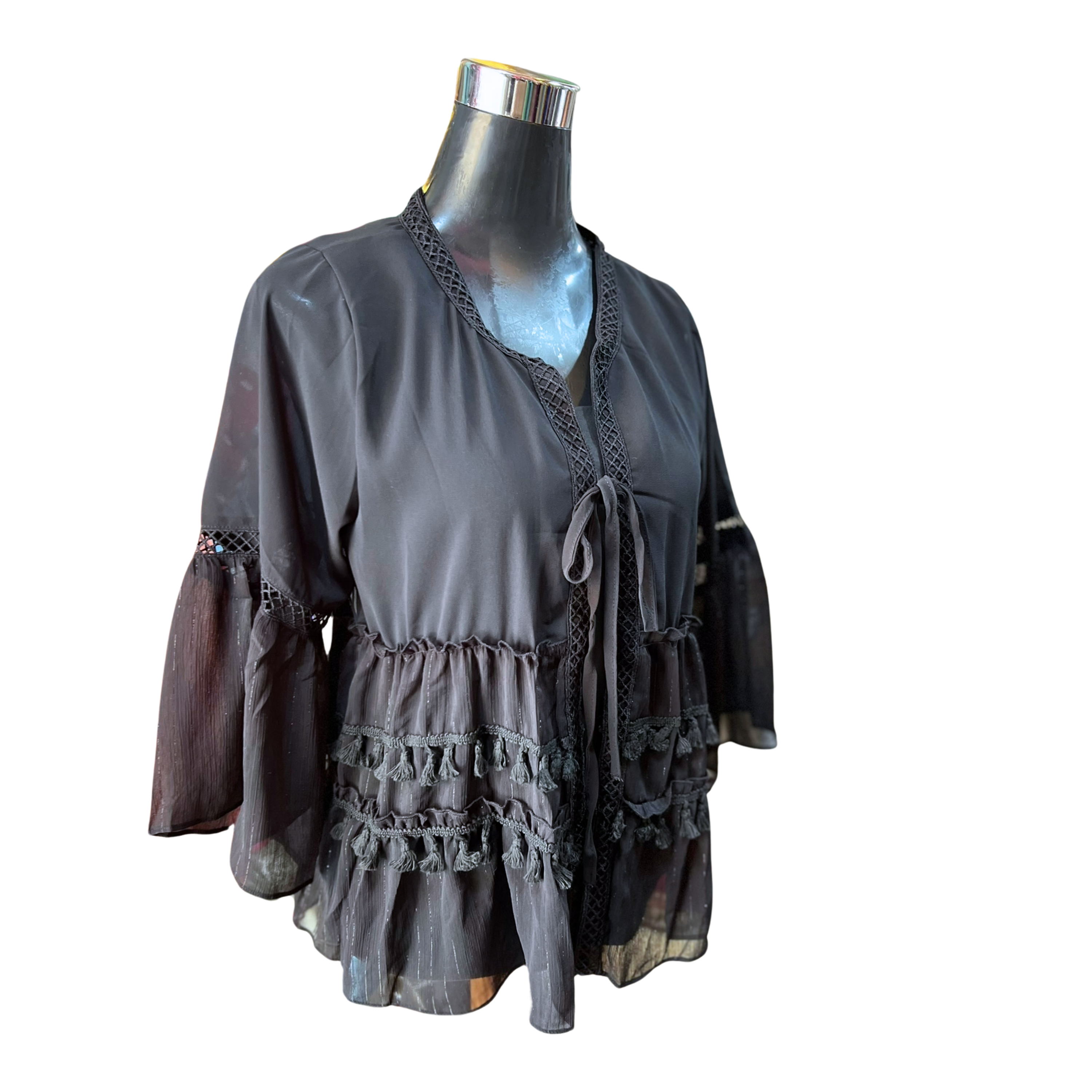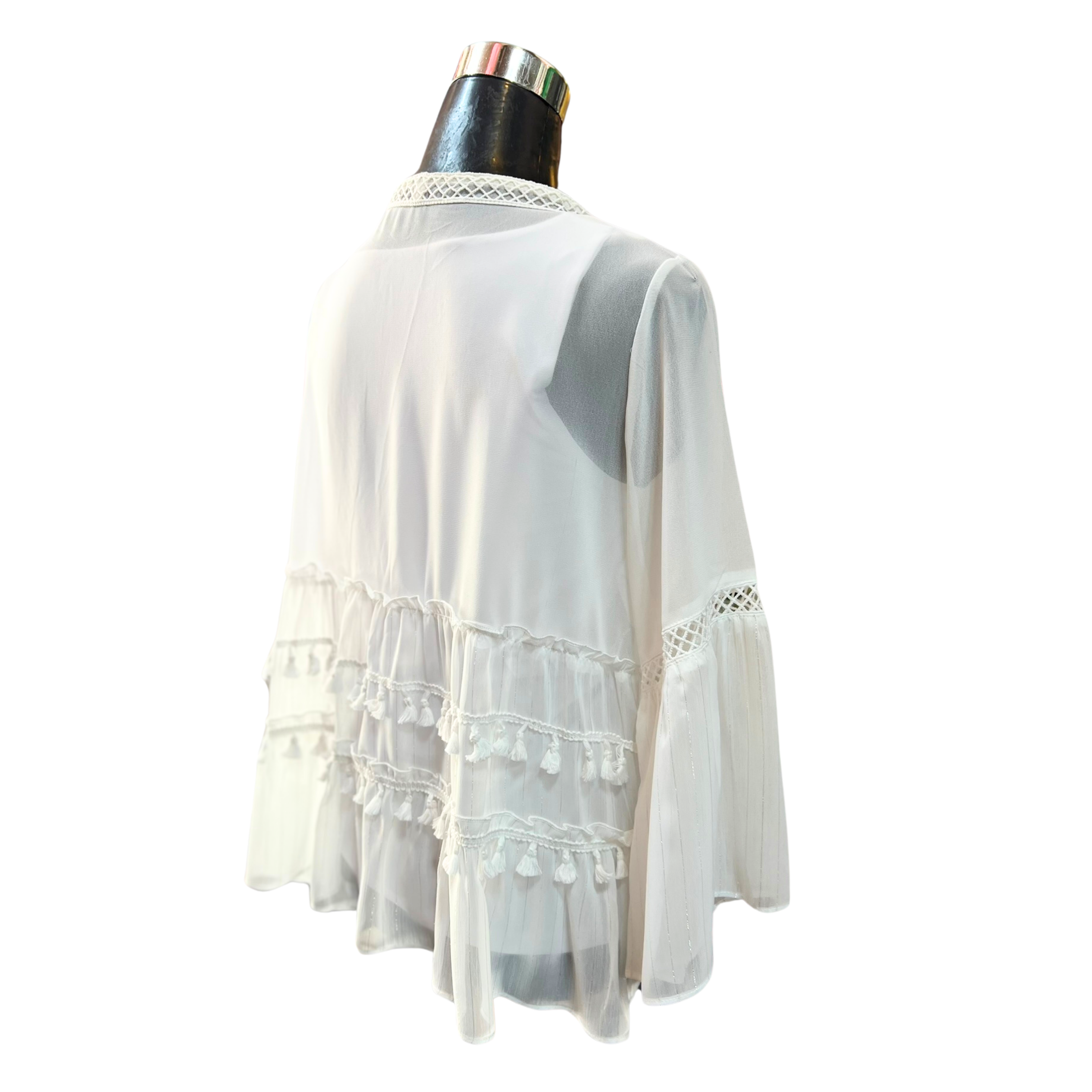Añade un toque de elegancia y estilo a tu outfit con este tapado de gasa con lurex y detalles de flecos. Su diseño ligero y brillante lo convierte en una opción ideal para ocasiones especiales o para complementar tus looks de día o de noche. Perfecto para quienes buscan una prenda versátil y sofisticada.